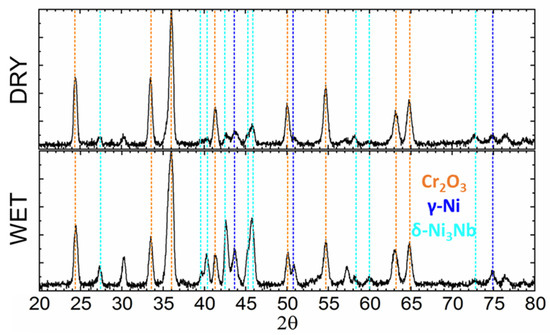 Figure 2 presents the XRD spectra recorded in the B-B geometry for the 718Plus superalloy samples oxidized for 4000 h in dry and wet air. The samples did not differ in terms of phase composition. The analysis of the spectra revealed that the main oxide phase in the oxidation product was Cr2O3. Intense peaks originating from the γ and δ-Ni3Nb phases were also identified.