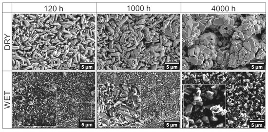 Figure 3 shows the surface morphology of the scales formed on the 718Plus superalloy in dry and wet air after oxidation of 120, 1000 and 4000 h. These observations show that the scales’ surface morphology differs to a significant degree. After 120 h of oxidation in dry air, the surface of the corresponding scale features numerous plate-like Cr2O3 crystallites spaced apart from one another. The crystallites were approximately 3–4 μm in length, while their thickness did not exceed 1 μm. They protruded from the surface of an inner layer composed of fine grains with diameters of approximately several dozen hundred nanometres. As oxidation times extended, the crystallites increased in size, lost their plate-like shape, and transformed into a compact layer, which is most evident in case of the sample oxidized for 4000 h. During oxidation in wet air, a fine-grained scale was formed on the 718Plus superalloy; no large, plate-like Cr2O3 crystallites similar to those observed for the samples oxidized in dry air were found in this case. After 120 h of oxidation in wet air, the size of crystallites found on the surface of the scale did not exceed 1 μm, and chemical composition analysis showed that these crystallites contained titanium (as shown later in Figure 6). For longer oxidation duration, the grains grew larger, but this process was very gradual, and only a few of them were more than 3 μm in size after 4000 h of oxidation.
