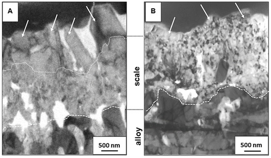 Figure 5 compares the microstructures of oxide scales formed on the 718Plus superalloy after oxidation in dry (A) and wet (B) air. These TEM observations were conducted using lamellae prepared via FIB. They are consistent with the previously presented results of SEM observations, and they confirm that there are significant differences in scale microstructure depending on the oxidation atmosphere. The scale formed in dry air has two layers: a coarse-crystalline outer layer (white arrows—Figure 5A) and a fine-crystalline inner layer. On the other hand, while the scale formed after oxidation in wet air has a similar thickness; it consists only of a single layer and is composed predominantly of fine, equiaxed grains with a size of up to 200 nm and only a few slightly larger grains on the outer surface (white arrows—Figure 5B), as in case of the inner layer of the scale formed in dry air.