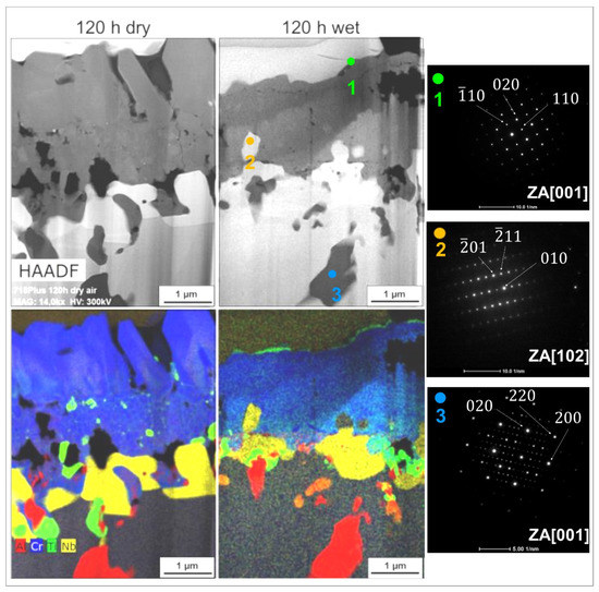 The 718Plus sample cross-sections after oxidation at 850 °C for 120 h in dry (left) and wet (right) air: microstructure (STEM-HAADF) and corresponding selected area diffraction patterns taken from areas 1–3 marked in the microstructure images as well as chemical maps of selected elements (STEM-EDXS).