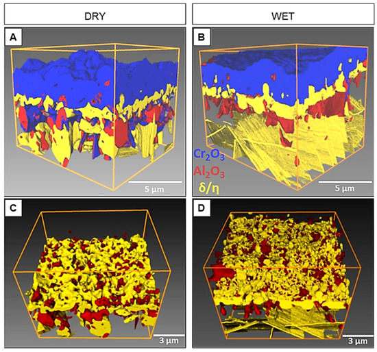 The 3D visualization of the oxide scale formed on the 718Plus superalloy after oxidation at 850 °C for 120 h in dry (A) and wet (B) air, rendered via tomographic reconstruction; microstructural features of individual components: Al2O3, δ and η phases; (C)—dry air, (D)—wet air.