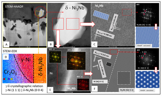 Figure 8 presents the results of microscopic analyses conducted at resolutions down to the atomic level. Microscopic analyses are supplemented with STEM-EDXS distribution maps of selected chemical elements. Figure 8A shows a STEM-HAADF image of the scale and the area underneath, highlighting the presence of δ phase particles in this area (Figure 8B). The HRSTEM-HAADF imaging revealed columns of δ-Ni3Nb phase atoms (Figure 8C). A JEMS-simulated HAADF image of the same δ-Ni3Nb arrangement is superimposed onto the image in this figure (highlighted in blue), while the fast Fourier transform (FFT) of this image is shown in the rightmost part of this figure. After comparing the symmetry and spot distances in the FFT image with the diffractograms of the δ-Ni3Nb phase calculated using JEMS for various orientations (zone axis, ZA), it can be concluded that the high-resolution HAADF image corresponds to [−110] zone axis of the δ-Ni3Nb phase. The HAADF image calculated for this orientation matched the experimental high-resolution image (Figure 8C). In consequence, interplanar distances (dh,k,l) of the δ-Ni3Nb phase marked in Figure 8C allowed this phase to be identified based on the crystallographic data from the ICSD database. It should be noted that when detecting high-angle scattering, the intensity reaching the HAADF detector is almost proportional to the square of the atomic number (Z2), allowing the strong chemical contrast (Z-contrast [30]) of atom columns in their actual positions to be determined. The bright and dark spots observed in the δ-Ni3Nb phase therefore correspond to Nb and Ni, respectively. Figure 8D shows superimposed STEM-EDXS maps of selected chemical elements, and these maps confirm the chemical and crystallographic complexity of the particle shown in Figure 8B. Figure 8E presents FFT images for the γ and δ-Ni3Nb phases as well as their superimposition, from which it follows that the gγ = [1−1−1] and gδ = [400] reflections are very close, indicating that the interplanar distance between the {111}γ and {004}δ crystallographic planes is small. These planes are also parallel to one another. Figure 8F shows the HRSTEM-HAADF image of the δ-Ni3Nb precipitate and the γ matrix atom columns. The rightmost small figures present a HAADF image of the γ phase nanostructure and its image simulated by JEMS (highlighted in blue) as well as an FFT for this phase. The presented analyses lead to the conclusion that δ-Ni3Nb particles precipitate from a supersaturated γ matrix and that the (111)γ‖(004)δ crystallographic orientation is preserved. This relationship was also found in the literature [31,32].