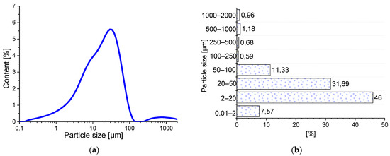 Particle size distribution of the brick powder (BP): (a) the graining curve; (b) percentage of grains in different size classes.