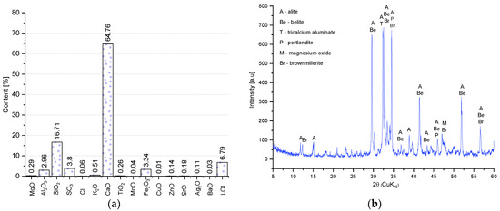 The chemical composition (by means of the XRF) of the CEM I 42.5R and the XRD pattern of the mineral composition of the cement used are shown in Figure 3. The dominant components of the cement is CaO, which accounts for 64.7%, and SiO2 (16.7%). Trace amounts of elements were also detected in the cement: Cl, MnO, CuO, ZnO, SrO, Ag2O, and BaO with a total content of 0.57%. Due to their trace amounts, they have a marginal effect on the physical and chemical properties of the binder. The XRD pattern shows all the major phases that have been identified by their characteristic interplanar distances dhkl. The cement used is predominantly alite (dhkl = 2.78; 2.76; 3.05; 2.61; 2.74 Å), belite (dhkl = 2.78; 2.79; 2.75; 2.62; 2.72 Å), tricalcium aluminate (dhkl = 7.61 Å), and brownmillerite (dhkl = 7.12, 7.45 Å).