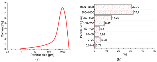 The results of the BP particle size distribution (Figure 4) show an approximately mono-modal character. The material is dominated by grains with particle sizes in the range of 250–1000 µm, which account for 76.1% content. There are also much smaller grains in the range of 0.2–20 µm (5.3%). The grain size characteristics indicate that the applied BP is closer in grain size to finely ground sand than to binder. Thus, the pozzolanic activity is very low and the role of BP in the mortars tested will be mainly that of a microfiller.