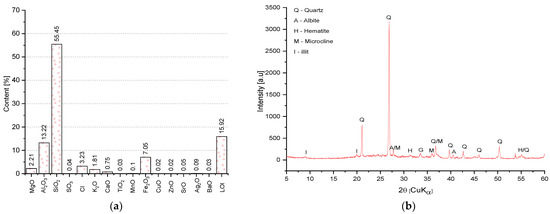 The chemical composition (by means of the XRF) and inorganic crystalline phases identified on the XRD pattern are shown in Figure 5. The main constituent of BP is SiO2, which accounts for (55.5%), Al2O3 (13.2%), and Fe2O3 (7.1%). In the chemical composition of BP also can be found trace amounts of elements that do not affect the physical and chemical properties of BP. These include: Cl, MnO, CuO, ZnO, SrO, Ag2O, BaO. The total content of these elements is 1.06%.