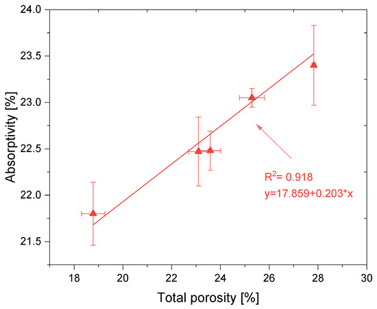 Figure 6 shows the water absorption in a function of a porosity and a linear model of their relationship. Both parameters change with the amount of BP used. The linear trend is characterized by a good coefficient of determination R2 equal to 0.918. The total porosity of the mortars is the second most important parameter related to controlling the water absorption of the material: the higher the porosity, the higher the amount of water that can fill the pores. The water penetration behavior is corresponding to the pore distribution of concrete [57,58,59]. The BP addition gradually promoted its flow. These results suggest that the increase in porosity of hardened mortars is caused by the BP addition, and the differences in microstructure are due to its physical properties. BP particles increase the pore volume in the cured matrix [60,61]. The reduction in density leads to an obvious increase in porosity [62].