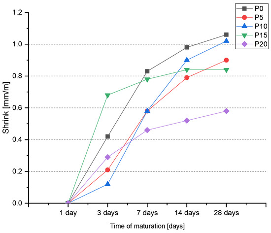 The effect of BP addition on linear shrinkage (Figure 7) is already visible after 3 days. P5 exhibited half the shrinkage of the reference sample. The smallest early shrinkage was recorded for P10 at 0.12 mm/m, which was 71.4% less than that of the P0 mortar. The P20 mortars also showed 69.1% less shrinkage after 3 days of curing. After 7 days of curing, the effect of BP is still visible. Mortars P5, P15, P20 reached lower linear shrinkage as well as lower shrinkage increment than the P0. The mortar with the highest BP content had the lowest shrinkage value. The addition of 20% reduced shrinkage by 44.6% relative to P0. Test results after 14 days of maturation confirm previous trends. Samples P5, P10, P15, and P20 achieved less shrinkage than P0. After 28 days of maturation, the last shrinkage measurement was performed. All series of BP-modified mortars showed less shrinkage than the reference sample. The lowest value of linear shrinkage was achieved by the mortar with the highest BP addition, and was 45.3% lower than the P0. The average decrease in shrinkage for all BP-modified mortars was 21.3%. The increase/decrease in shrinkage is mainly due to the significant evaporation of the batch water for the mortar tested. Taking into account that the shrinkage value decreased with BP addition, it means that in this case the kinetics of cement hydration reaction decreases with BP addition [38]. Similar relationships were observed by other researchers in their studies [51].