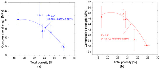 Relation between the total porosity and compressive strength: (a) reference samples, (b) samples subjected to the thermal stress.