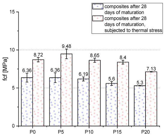 The highest fcf value among the reference samples was obtained for the P0 and mortar with 5% wt. BP addition (6.36 MPa)—Figure 10. fcf decreased above 5% wt. BP addition. The lowest strength was obtained for mortars with 20% wt. BP addition. The relationship between the amount of additive and fcf mirrors the fc—the strength decreases above the 5% of the additive. Similar results were obtained by other researchers who observed an increase in fcf for BP additive below 10% [28,38]. In addition, researchers have observed a significant increase in strength after 90 days of curing [71].