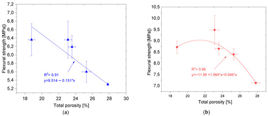 Relation between the total porosity and flexural strength: (a) reference samples, (b) samples subjected to the thermal stress.