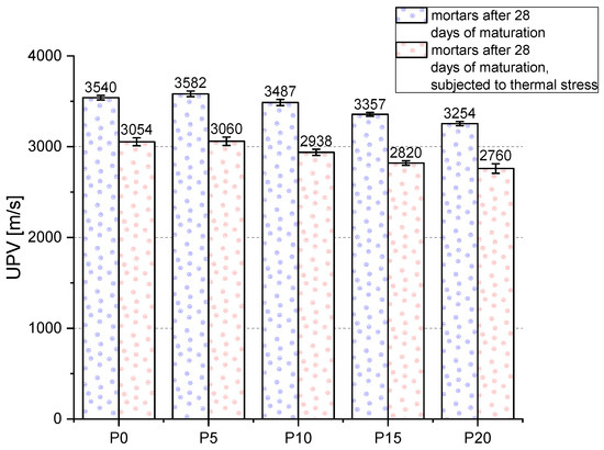 The variation of the UPV for reference mortars and after thermal load is shown in Figure 12. The highest UPV value for reference samples was obtained for P5 mortars, the result was 1.2% higher than for P0 mortars. With a higher amount of additive, the value of the index successively decreased. The lowest pulse velocity was obtained for P20 samples, which had the highest porosity. Similar studies were also conducted by other researchers [74,75,76]. The pulse velocity after thermal loading was lower compared to the reference samples. This is related to the water donation of the sample, remodeling of the C-S-H phase and increase in the porosity of the sample. The decrease in UPV with increasing BP content is related to the porous structure of BP grains. With higher BP content, the resultant porosity of the sample increases. The differences in UPV values between the series should be considered statistically significant because the scatter of results within a single series is usually very small.