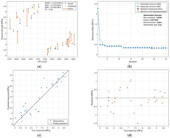 Support vector machine (SVM) prediction of the compressive strength: (a) fc-UPV relation with prediction errors; (b) optimization plot; (c) predicted-measured values relation; (d) distribution of residuals; RMSE—root mean square error; MSE—mean square error; MAE—mean absolute error; R2—coefficient of determination.