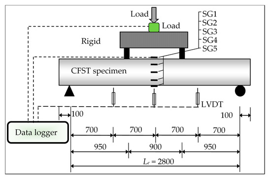 All specimens were tested under four-point static loads, as shown in the schematic of the test setup in Figure 2. A hydraulic jack with a maximum capacity of 500 kN was used to apply the static load on the suggested CFST specimens. Utilizing linear variable differential transducers (LVDTs) type KYOWA, Osaka, Japan, the vertical deflections of the specimens were recorded at different locations. The strain gauges SG1 to SG5 were fixed vertically at the mid-span of each CFST specimen. A data logger was used for collection of the data from the load cell, strain gauges, and LVDTs during the tests, and these data were recorded in a computerized system.