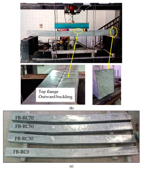 All specimens were tested beyond their strength capacities in order to study their extreme failure performance. The hollow steel tube specimen (HB) showed the inward tube’s buckling failure at the support points only, wherein the failure of tube’s webs was increased gradually by increasing the applied load, as shown in Figure 3a. Meanwhile, all filled specimens (FB-RC0, FB-RC30, FB-RC50, and FB-RC70) showed almost typical failure modes regardless of the types of their concrete mixtures. It was found that, for all filled specimens, outward buckling failure started occurring at the top tube’s flange, between the two-point loads of these filed specimens, particularly when the applied load values reached about 70–80% of their ultimate loading capacity, as shown in Figure 3b. This performance was due to the effects of the concrete infill materials, which mainly prevented the occurrence of inward buckling failure of the steel tube. Figure 3c presents all filled specimens after testing at the extreme failure limits.