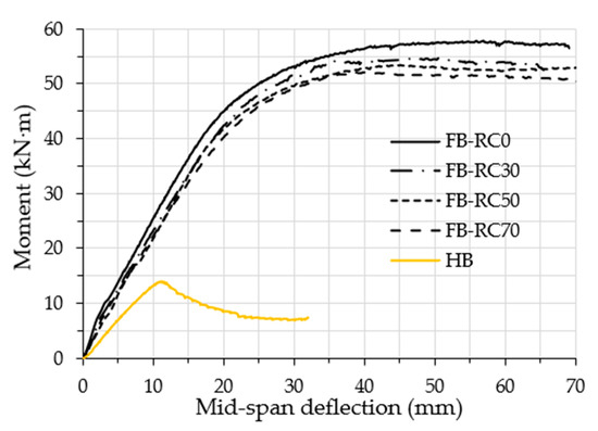 The Mu values of the tested specimens are presented in Table 1. The HB specimen achieved the ultimate flexural capacity of 14.1 kN·m; this capacity increased to 57.7 kN·m when the same fabricated steel tubular specimen was filled with normal concrete (FB-RC0), achieving an improvement of 409%. The tubular specimen filled with varied recycled concrete achieved Mu values that were slightly lower than those of the FB-RC0 specimen (57.7 kN·m); these values were 53.7 kN·m, 52.6 kN·m and 51.5 kN·m, for specimens FB-RC30, FB-RC50 and FB-RC70, respectively. In addition, it was noticed that, regardless of the aggregate replacement percentages, the concrete filled tubular specimens achieved much higher flexural strength capacity values as compared to the capacity of the hollow specimen (HB), with a strength improvement of about 363 to 381%. It is worth mentioning that the self-weight of the tube beam was substantially increased due to the addition of the filled concrete; however, the flexural strength was remarkably enhanced, as stated above (363–409%). From the structural engineering point of view, this represents a very important finding regardless of the increment of the weight, and, in this case, the role of the structural engineer, who can prospectively determine scenarios in which this would be reliable for the targeted purpose of construction projects. On the other hand, the cost was also found to be a vital element in the construction design when we compared the concrete cost with the steel cost; this was the case because, in global terms, the cost of 1 ton of steel is about 15–20 times the cost of 1 ton of concrete material.