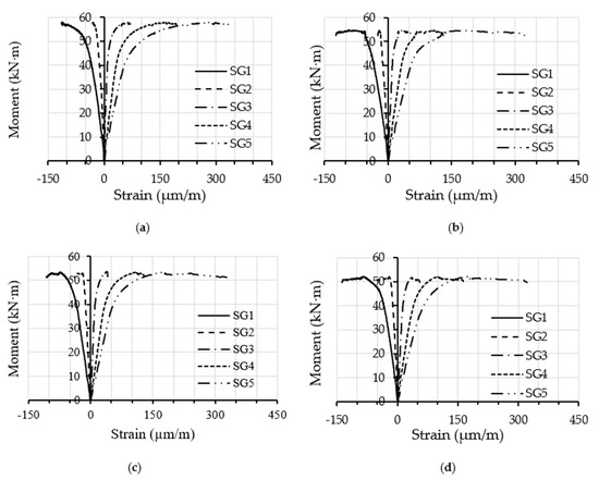 Moment vs. longitudinal strain relationships of the filled specimens: (a) FB-RC0; (b) FB-RC30; (c) FB-RC50; (d) FB-RC70.