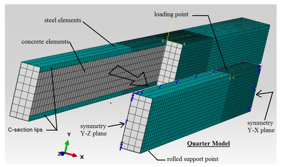 The suggested CFST beam was further investigated in terms of its flexural behaviour by using the ABAQUS 6.14 software to conduct non-linear finite element (FE) analysis. In order to reduce the time conception of the analyses of the models, a typical 3D quarter model was built to simulate the actual tested CFST specimen, as shown in Figure 8, which had the advantages of the symmetric cross-section and the beam’s loading scenario already having been prepared [15,19,56,57,58]. The actual test loading scenario was implemented in the FE modelling scenario by allowing the nodes that were positioned at the upper tube’s flange (loading point) to gradually move downwards during the FE analysis, using the incremental downward displacement option (displacement control approach), which is available in the software. The nodes placed at the support’s location were restricted from horizontal and vertical movement, but they were allowed to freely rotate around the X-axis to simulate the roller support. Then, the loading value of the FE model was obtained from the reaction forces that were observed at the support’s nodes [19,56].