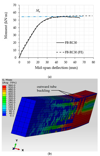 The validity of the current FE models was confirmed via the corresponding experimental results; almost all of the filled specimens with varied concrete mixtures achieved similar behaviours and close flexural strength capacities. Thus, the FB-RC30 specimen (a steel tubular beam filled with a recycled concrete mixture of 30% EPS beads) was selected to verify the relevant FE model. The numerical analysis showed that the moment vs. mid-span deflection relationship of the FB-RC30 (FE) model sufficiently agreed with that of the corresponding tested specimen (FB-RC30), as shown in Figure 9a. The flexural strength capacity value of the numerical model of FB-RC30 was overestimated by about 3.1% (55.4 kN·m) as compared to that obtained from the corresponding tested specimen, which was an acceptable degree of deviation. In addition, the outward buckling failure occurring at the top-half cross-section of the tested FB-RC30 specimen, for the distance between the two-point loads, was numerically simulated by the relevant FE model, as shown in Figure 9b.