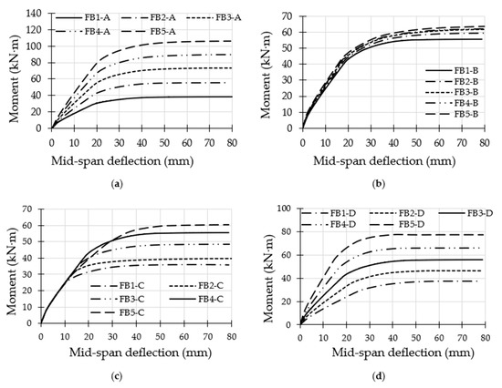 Moment vs. mid-span deflection of CFST models with varied parameters: (a) group A; (b) group B; (c) group C; (d) group D.