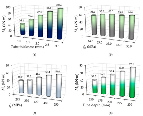 The ultimate bending strength capacities (Mu) of the analysed FE models are given in Table 3. In addition, they are independently compared for each group in Figure 11. Generally, compared to all of the studied parameters, increasing the tube’s thickness (group A) led to major improvements in the suggested CFST models’ Mu values; these improvements were even more significant than the effects of tube’s depth (Group D). Meanwhile, increasing the strength of the concrete infill led to limited improvements in their Mu values. This can be considered a reasonable outcome since the tube’s thickness directly increased the overall area of the steel cross-section, including the internal stiffeners (the lips of the C-sections) at the top and bottom beam’s flanges. Similar outcomes have been recorded in other studies for the conventional CFST beams that were investigated here [10,14,61]. For example, the FB2-A control model with 1.5 mm thickness achieved an Mu value of 55.4 kN·m; this value was increased to about 30.6% (72.4 kN·m) and 60.3% (88.8 kN·m) when only the tube’s thickness was increased to 2.0 mm and 2.5 mm, respectively. Meanwhile, the same Mu value (55.4 kN·m) for the FB1-B model, in which concrete infill of 14.6 MPa strength was used, was increased by about 12.2% (62.2 kN·m) when a three-times-higher compressive strength was used (55 MPa; model FB5-B).