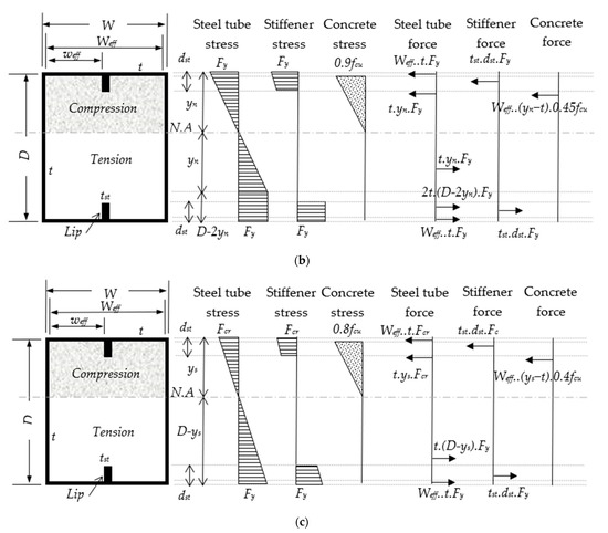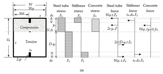 - Finally, when the forces over the stiffened CFST beam’s cross-section attained equilibrium (see Figure 14), the summarized forms of the new analytical formula for predicting the Mn for each section classification could be expressed as follows: