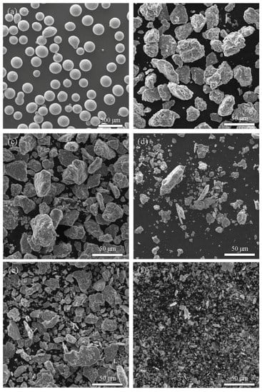 Surface morphologies of TiAl powder: (a) primary powder, (b) ball-milled powder at 200 r/min for 15 h (particle size = 29 μm), (c) ball-milled powder at 250 r/min for 15 h (particle size = 26 μm), (d) ball-milled powder at 250 r/min for 20 h (particle size = 17 μm), (e) ball-milled powder at 250 r/min for 15 h (particle size = 15 μm), (f) ball-milled powder at 300 r/min for 25 h (particle size = 5 μm). (b–d) dry-milled, (e,f) wet-milled.