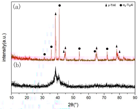 XRD spectra of TiAl powder: (a) primary powder, (b) ball-milled powder for 15 h (particle size = 26 μm).
