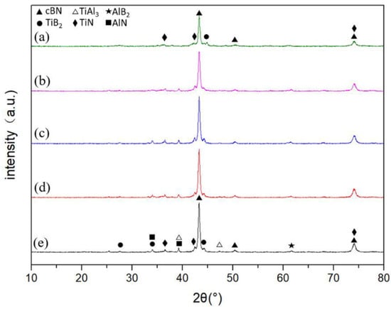 XRD spectra of sintered cBN composites: (a) 5 μm, (b) 15 μm, (c) 17 μm, (d) 26 μm, (e) 29 μm.