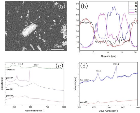 A Raman spectroscopy analysis was performed on points A and B in Figure 4a, and the corresponding results are presented in Figure 4c,d, respectively. At point A of the diffusion layer, the peaks at 231.0 cm−1 [15], 313.2 cm−1 [16], and 576.7 cm−1 [17] appeared from TiB2, AlN, and TiN, respectively. At point B, the peaks at 1055.0 cm−1 and 1305.4 cm−1 [18] originated from cBN. The main bonding in the composite sample were Ti-B and Al-N. The peaks of Ti-rich compounds were much higher than those of Al-rich compounds, indicating that the content of nitrides and borides in Ti was much higher than in Al.