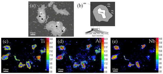 An EPMA analysis was performed on each point in Figure 5a. The corresponding results are presented in Table 1. The white phases surrounded by the diffusion layer are indicated by 1# and 3# (Figure 5a). In these areas, the content of Al was high, whereas the contents of B and N were low, indicating that these areas were mainly composed of TiAl3. The phases of the gray diffusion layer are indicated by 2# and 4# (Figure 5a). The content of Ti in these areas was significantly higher than in other regions. The contents of B and N were also high in the diffusion layer. Thus, it is concluded that Ti was rapidly consumed to form a large portion of the TiB2 and TiN phases. Figure 5e shows that the Nb elements were distributed in the center of the original TiAl area and hardly diffused to the matrix. There was no phase that contained Nb in the XRD spectra, which means that Nb was solubilized in the TiAl3 phase. The line scan in Figure 4b indicates that when the EDS signal moved from the matrix to the original TiAl region, B and N content decreased, whereas Al and Ti content increased. Al content reached the first peak ahead of Ti, and then the Al content gradually decreased, while the Ti content maximized. The existence of AlN and AlB2 peaks in the XRD spectra and the presence of Al-N peaks in the Raman spectrum indicate that the nitrides and borides of Al were distributed in the thin Al-rich region against the black matrix and formed cBN/AlN, AlB2/TiN, and TiB2/TiAl3-layered structures, as showed in Figure 5b.