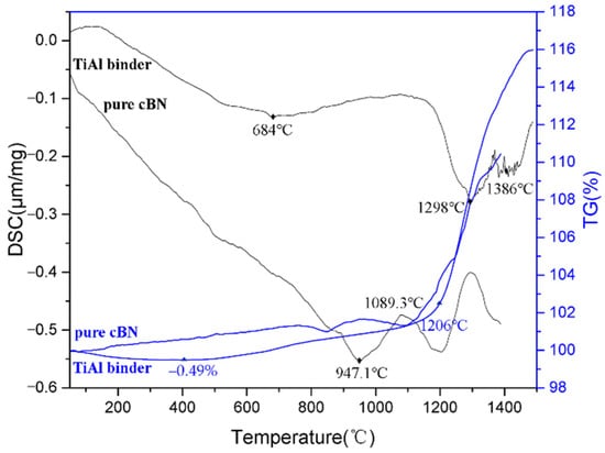 A thermal analysis was performed on the cBN composite, with an average TiAl particle size of 15 μm. Its TG-DSC (Thermo Gravimetry–Differential Scanning Calorimetry analysis) curve and pure cBN abrasives are displayed in Figure 7. The –0.49% mass loss in the early stage of the TG curve occurred due to the desorption of the adsorbed gas in the composite during the heating stage. The sample was then slowly oxidized to a temperature of 1206 °C, and subsequently, the oxidation process accelerated. At this time, the oxidation and evaporation of the sample proceeded simultaneously. The weight gain during oxidation was much greater than that during evaporation. The maximum weight loss occurred at 1298 °C. The surface oxide film began to break, and a large amount of oxygen entered the interior of the composite and quickly reacted with cBN. Finally, a large amount of substrate reacted at 1386 °C. Compared with pure cBN abrasives, the sample had less weight gain at a temperature of nearly 1250 °C [25].