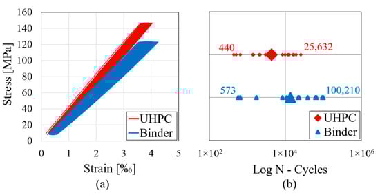 Results of experimental fatigue tests on UHPC and binder: (a) Typical stress–strain curves during fatigue; (b) Lifetime until fatigue failure (mean and single values).