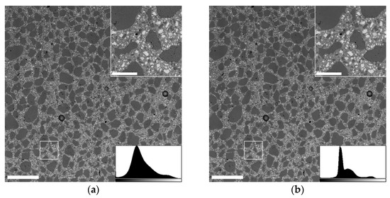 Material or atomic number (Z) contrast imaging of backscattered electrons (BSE) with a concentric ring detector was employed to easily discern between aggregate, binder matrix, and unhydrated cement clinker. To survey and analyze large surface areas, individual images with a horizontal field width of ca. 1 mm and a pixel size of below 1 µm were acquired in a serpentine pattern, overlapping by 20% in both the x and y directions. The individual images were fused using a FIJI/ImageJ plugin [28] to create a single large-area image of each sample. These were cropped to exclude specimen edges, covering 8000×8000 pixels (ca. 5.6 × 5.6 mm²) in total.