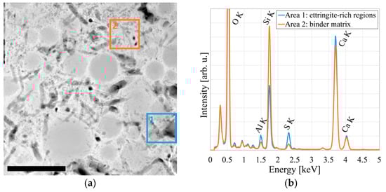 Both scanning (SEM) and transmission electron microscopy (TEM) have been applied to cementitious materials for four decades [5,6,7,8,9], but so far, few if any reports focused on the effects of fatigue on the microstructure of the binder matrix. We aim to investigate these effects, down to their origins on the nanoscale, using SEM as well as scanning TEM on lamella samples prepared using focused ion beam (FIB) techniques. In past research, energy-dispersive X-ray spectroscopy (EDS) applied to cementitious materials has mostly served to determine the local chemical composition of the binder matrix [10,11,12]. However, we additionally employ EDS to detect and identify objects on the nanoscale.