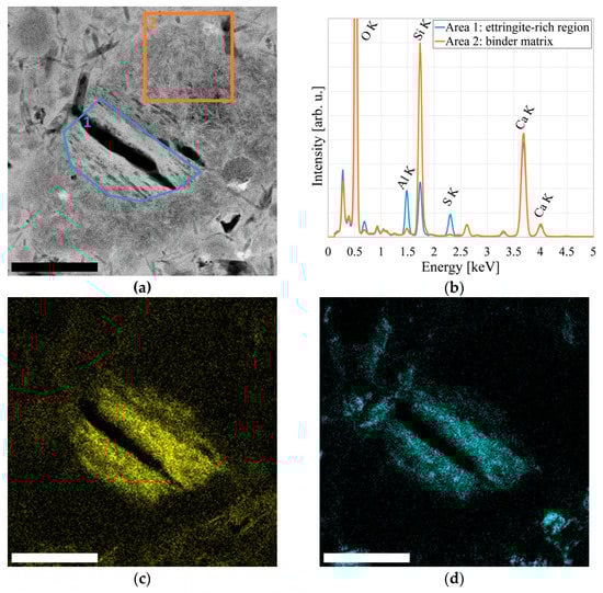 Sample regions containing nanoscale cracks found in after-failure samples exhibit especially high contents of aluminum and sulfur and a very low silicon content, underlining the connection between fatigue damage and nanoscale ettringite transformation. HAADF-STEM images as well as EDS spectra and elemental distribution maps of one such region are displayed in Figure 6.