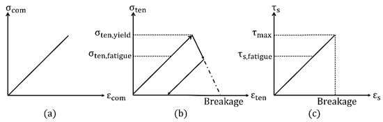 Since concrete is known to fail due to internal transverse tensile stresses, the main damaging mechanisms were integrated into the tensile response of the model. Additionally, to capture fatigue degradation from shear stresses, a fatigue damage was also integrated into shear mode. Note that bonds do not break or undergo any damage during pure compression. Figure 7 shows the rheological models for all three load types.