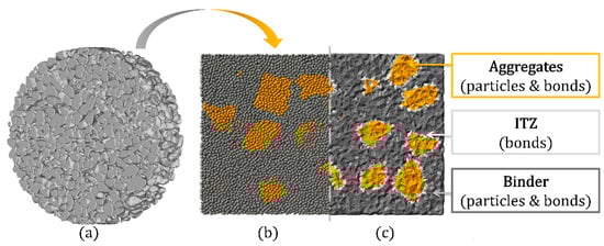 Cross-section detail of the structural three-phase UHPC model: (a) Reconstructed 3D models from µCT of aggregate grains; (b) Particle view of binder and aggregate without bonds; (c) Cross-section showing all particles and bonds.