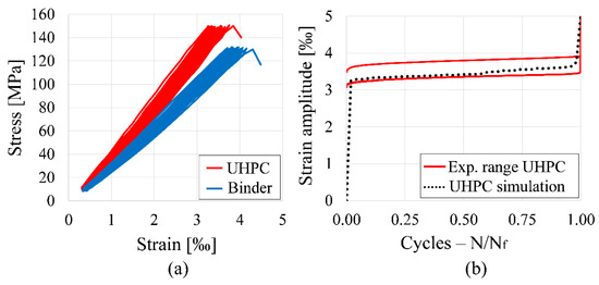 Macroscopic fatigue simulation results of UHPC using the proposed bond formulation with : (a) Hysteresis loops obtained from fatigue simulations for UHPC and binder; (b) Comparison of mean S-N curve from UHPC simulations with experimental range.