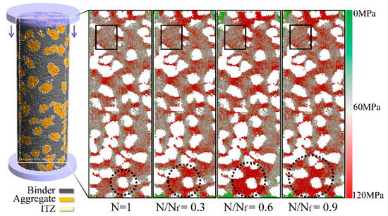 Visualization of stresses on primary binder particles at the upper load level and different fatigue stages; stresses are analyzed in the loading direction.