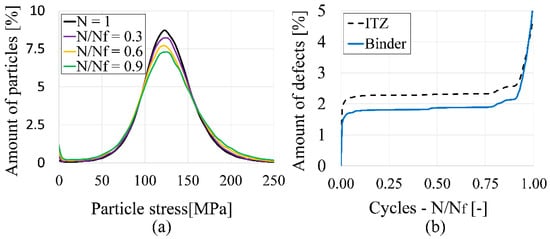 Additionally, average stress distributions on binder particles (in the loading direction) were analyzed at the same fatigue points and load levels (Figure 12a). For higher fatigue stages, the distributions broaden and their maxima drop. This indicates a more inhomogeneous distribution of stress among particles, resulting in the propagation of stress peaks into the surrounding matrix.