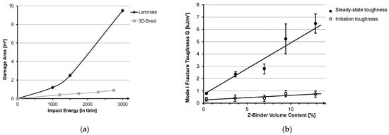 Energy required to initiate and propagate damage of 3D braids (a) [11]. Reprinted with permission from [11]. Copyright 2017 Elsevier. Effect of Z-binder yarn content on the initiation and steady-state fracture toughness values (b) [13]. Reprinted with permission from [13]. Copyright 2016 Elsevier.