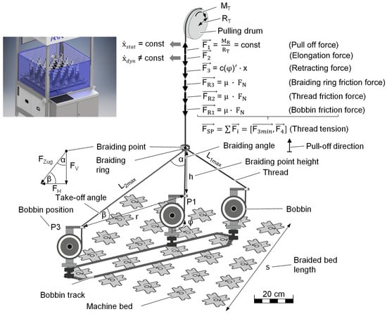 In 3D braiding, maintaining the yarn tension throughout the process is necessary to produce a uniform braid. The requirements for the bobbin are a sufficient compensation length to compensate for the yarn drop, the constant yarn tension required for a uniform preform structure, low filament breakage to ensure high mechanical properties and in general a stable process. For this purpose, the influences on the bobbin responsible for tension peaks and the resulting filament breakage are identified, and kinetic relationships are derived [24]. The filament tension of the braided yarn depends on the forces acting on the yarn (Figure 4).