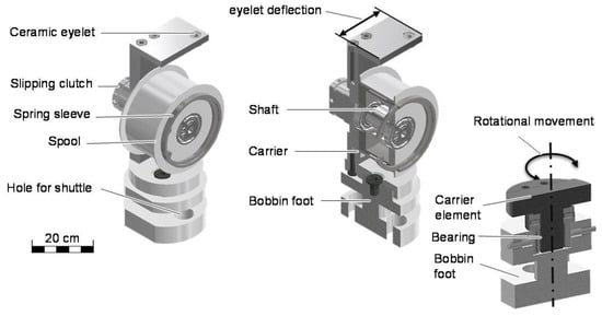 The conception is carried out by taking into account the influencing factors, which damage the yarn, and the state of the art regarding existing patents and publications of bobbin lace. To reduce complexity, only purely mechanical solutions for yarn compensation are considered. Motorized concepts are not considered due to the demanding and damage-prone control system as well as the high development risk. Taking into account the four influencing factors causing fiber damage (Table 1), a horizontally mounted bobbin is considered the most promising solution. In contrast to the patents [31] and [32], a toothed gear between the bobbin and the balancing mechanism is not used due to the aim of gentler processing. Due to the large radius, the compensation mechanism will be relocated into the bobbin [33,34,35,36,37]. The following purely mechanical compensation mechanisms are conceivable: a rolling spring with a slip clutch, according to [35], and a spiral spring with a slip clutch, according to [36] and [33]. A torsion spring according to [34] is considered insufficient in terms of compensation length. A magnetic brake or eddy current brake according to [34] and [38] is desirable. A cost–benefit analysis shows that a slipping clutch is a cost-efficient alternative for laboratory operation. Taking into account the above-mentioned aspects, a bobbin is developed according to Figure 5, which additionally has a deflected ceramic eyelet and has a rotational bobbin foot.