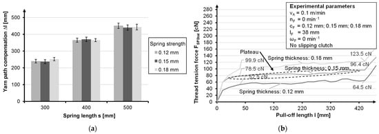 Stainless steel spring strips with a width of 12.7 mm and with a spring thickness of 0.12 mm, 0.15 mm and 0.18 mm are used as return springs. In order to maintain the yarn tension over the entire braiding process even at maximum deflection and to deflect it only at the reversal point, the spring length is selected accordingly (Figure 6a). With regard to the compensation travel, the choice of spring thickness is not decisive. Thicker springs only mean a higher thread force on the plate and less material in the spring barrel (Figure 6b). Regardless of the spring thickness, all springs show a spring characteristic with an approximately 20% increase in the yarn tension force (FSPStat) under a quasi-static load at minimum take-off speed without bobbin motion and without a slipping clutch.