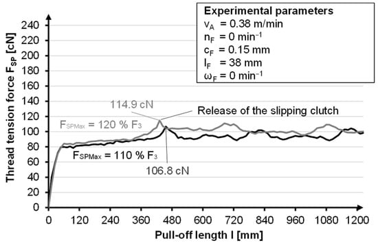 At the beginning, a linear increase in the thread tension force FSP, can be seen. This increase is a result of the spring characteristics. As soon as the maximum spring force, F3, is reached, the thread tension force, FSP, increases sharply. When a holding force, FSPMax, of 110% (120%) of the spring force is selected, the maximum thread tension force, FSP, is 106.8 cN (114.9 cN). As soon as the thread tension force exceeds the holding force, FSPMax, of the slipping clutch, the slipping clutch is released. The shaft can now rotate, and so the yarn tension force decreases again. The further course of the thread tension force shows that it remains constant with a deviation of approximately ± 10 cN.