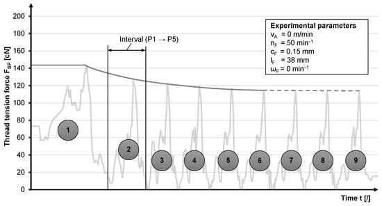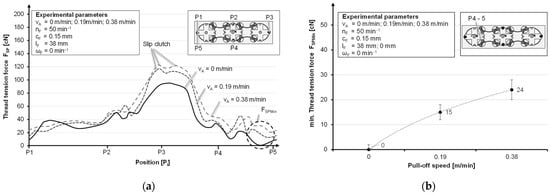 In order to obtain comparable values, the thread tensions in the steady state after eight cycles for 50 min−1 and four cycles for 3.75 min−1 are compared as a function of the horn gear speed. During start-up, the slip clutch release force is exceeded in the form of a peak with values of up to 140 cN. This delayed reaction usually occurs only initially and is interpreted as a breakaway force in the mixed friction contact due to downtime (Figure 8).