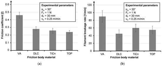 An excerpt from the tests, which shows the most concise results, is given. Due to the high braid ring position, a wrap angle (αW) of 30° is assumed for all tests. Since the data set is an extract from a larger data set, it should be noted for the sake of comparability that the values for the filament breakage rate refer to a haul-off speed of 1.25 m/min which represents an industrial production speed. The influence of base materials is investigated by using stainless steel, which is coated with diamond-like carbon (DLC) and titanium carbonitride (TiCN) of CeWOTec GmbH, Chemnitz, Germany and Topocrom No. 131 (TOP) of Topocrom GmbH, Stockach, Germany. The DLC layer causes the lowest filament breakage rate of all friction bodies (Figure 12b), but its coefficient of friction was not the lowest (Figure 12a).