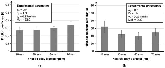 Influence of the friction body diameter regarding the friction coefficient (a) and influence of the friction body diameter regarding the filament breakage rate (b).