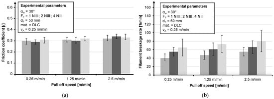 For the combination of an increase in fiber tension force and pull-off speed, the results show an increase in pre-stress, which causes an increase in the filament breakage rate (Figure 14b). The best results are obtained for a fiber force of 1 N. Increasing the pull-off speed caused a minimal increase in the coefficient of friction (Figure 14a). The combination of high force and high pull-off speed is particularly critical.